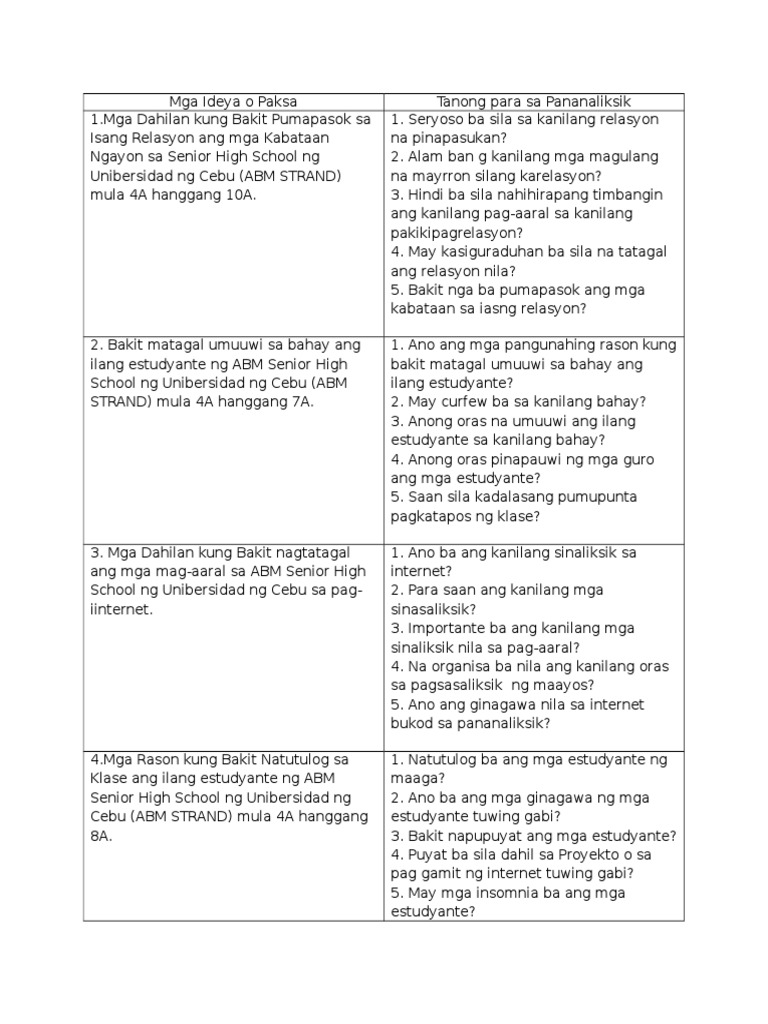 Mga Ideya O Paksa Tanong Para Sa Pananaliksik