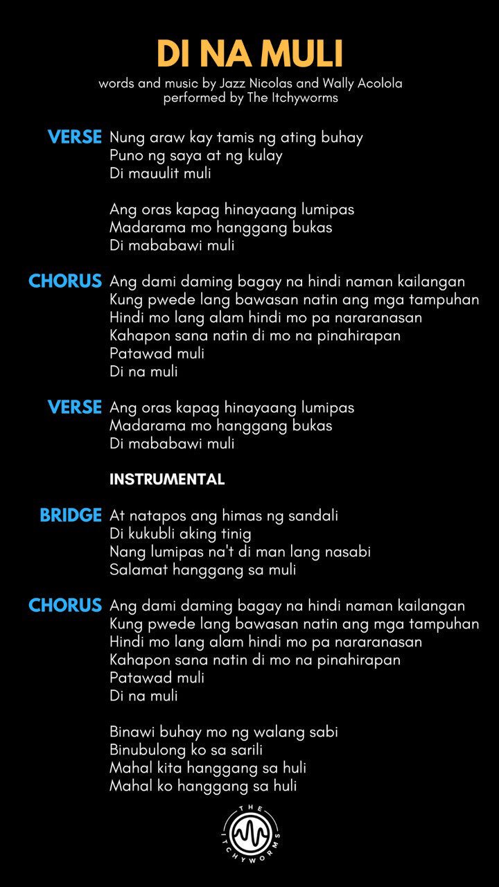 Nung araw kay tamis ng ating buhay Puno ng saya at ng kulay Di mauulit muli Ang oras kapag hinayaang lumipas Madarama mo hanggang bukas Di mababawi muli Ang dami daming bagay na hindi naman kailangan Kung pwede lang bawasan natin ang mga tampuhan Hindi mo lang alam hindi mo pa nararanasan Kahapon sana natin di mo na pinahirapan Patawad muli Di na muli Ang oras. Sa wala ngang bayan inat kasintahan Kay tamis ng buhay sa sariling bayan. 02032020 May tamang oras ang lahat ng pangyayari sa ating buhay.