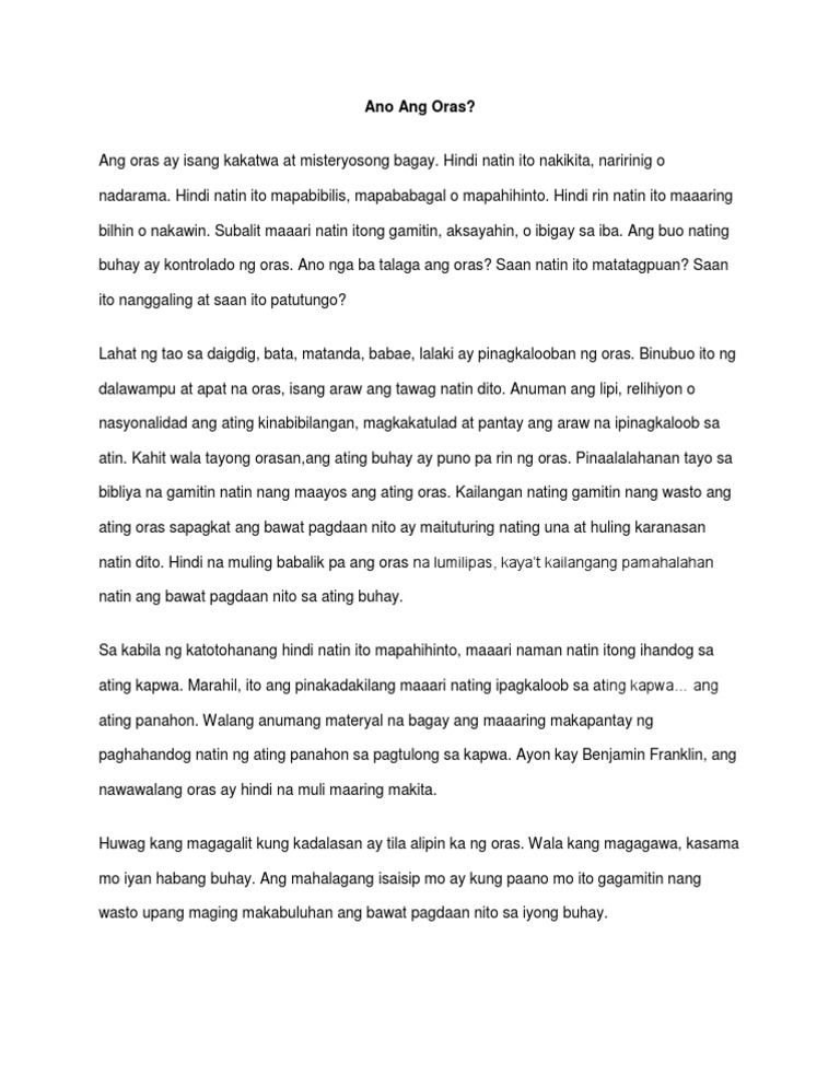 Kilala bilang panahon sa tagal ng mga bagay na napapailalim sa pagbabago na tumutukoy sa mga oras panahon oras araw linggo siglo at iba pa. Ang panahon ang siya lamang puhunan dito sa lupa. Ang orasan o oras nakabatay din sa ating mga ginagawa o pinagkakaabalahan sa buhay.
