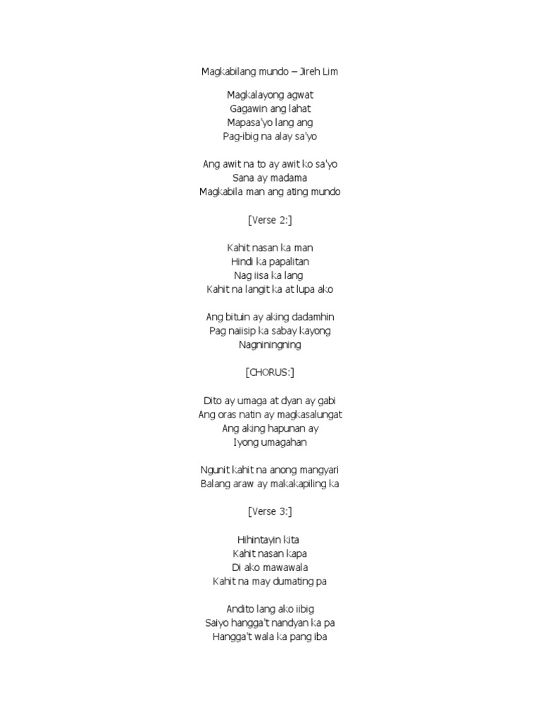 VERSE 1 G Magkalayong agwat Em7 Gagawin ang lahat C9 Mapasayo lang ang Cm Pag-ibig na alay sayo G Em7 Ang awit na to ay awit ko sayo C9 Sana ay madama Cm Magkabila man ang ating mundo VERSE 2 G Kahit nasan ka man Em7 Hindi ka papalitan C9 Nag iisa ka lang Cm Kahit na langit ka at lupa ako G Em7 Ang bituin ay. 21032015 Darating ang panahon Dumating na ang oras Sa Diyos ay walang noon at bukas bagkus isang walang katapusang NGAYON at NGAYON ang tamang oras. 19012021 Ang oras ay kaloob ng Diyos na ipinagkakatiwala sa tao 2.