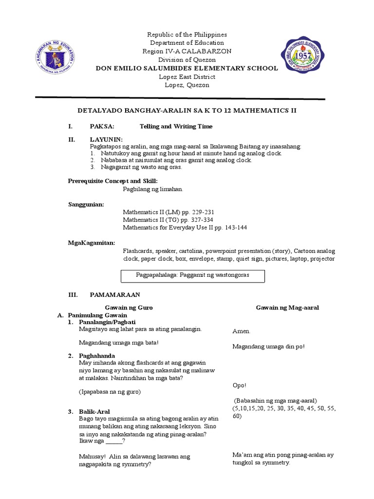 Banghay aralin sa matematika oras. Nakapagsusulat ng buod ng paksang tinalakay at naisasadula ito. Republic of the Philippines President Ramon Magsaysay State. Nagpasya ang kanyang mga magulang na siya ay pag- aralin ng sekundarya sa Occidental Mindoro National High School.