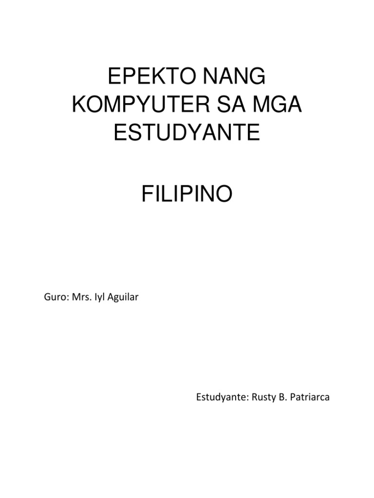 There are hopes that the right to suspend will be limited to the epekto ng kompyuter sa mga estudyante thesis actual construction obligations or also for example extend to suspension of the right to insure the works or suspension of works in related areas. INTRODUKSYON Ang paglalaro ng mga online games ay maaring makaapekto ng masama sa isang kabataan na gumgamit nito mahirap itong tanggihan lalo na at ito ay nasa paligid lamang ito ay nakakalibang at maaring makalimot tayo sa mundo ng ating mga alalahanin nagkakaroon ito ng masamang epekto katulad ng adiksyon. Noreen Baus-Billanes Propesor sa.